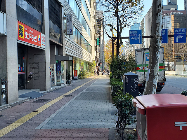 スギ薬局を右折し、50メートル先がヒューリック虎ノ門ビルになります。