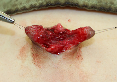酒井Ⅱ法の優れている点は、①邪魔になる索状物の切離 ②真皮弁ブリッジによる土台