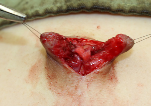 まず局所麻酔や笑気ガス麻酔します。無痛になったところで、潜っている乳頭を引き出し、 糸で牽引釣り上げて手術操作をしやすくします。