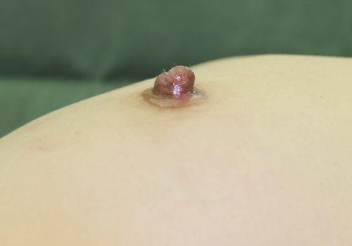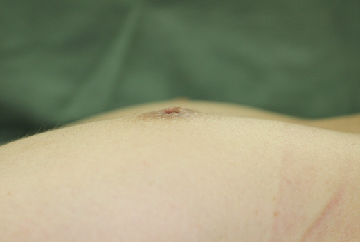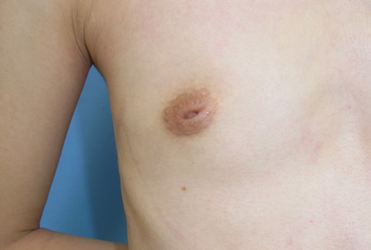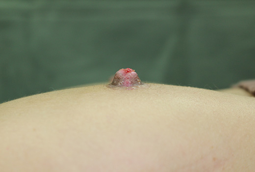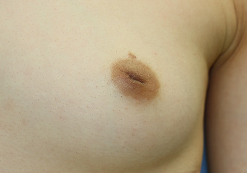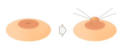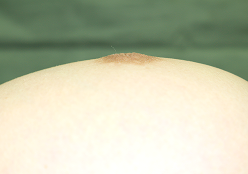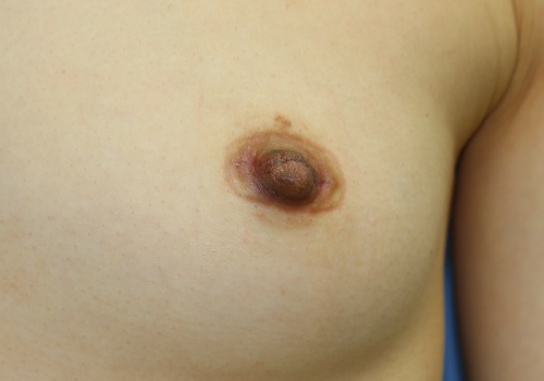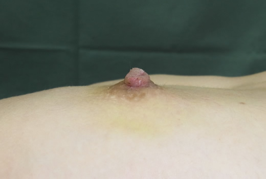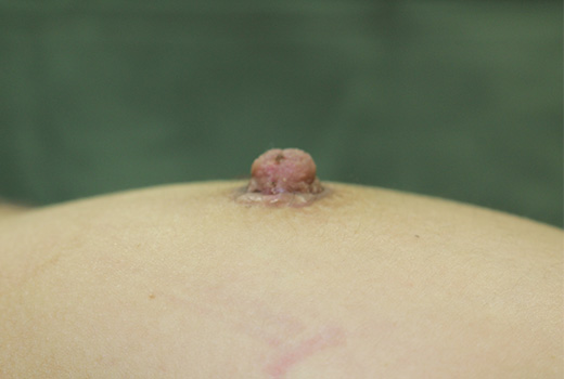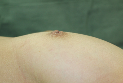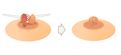 症状の程度により、真皮弁法や酒井Ⅱ法などを使い分けます。いずれの方法も傷は乳頭・乳輪のシワに同化して殆どわかりませんし、乳管を温存しますので授乳も可能となります。