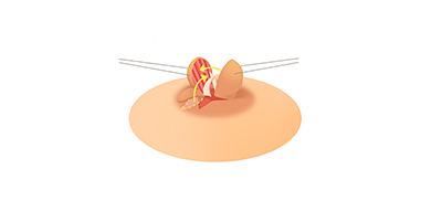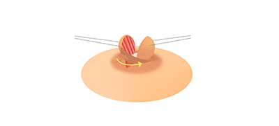 乳頭を潜らせてしまう(陥没させてしまう)原因となる線維性索状物を、手術用ハサミで縦に裂いて解除します。この時、乳管や知覚神経を愛護的に温存しながら索状物を縦に裂くのがポイントとなります。この操作によって陥没乳頭の原因となる索状物を除去しつつ、授乳機能(乳管)も温存する事が可能になるわけです。